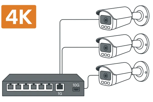Гигабитного uplink достаточно для небольших систем. Но если у вас 12, 16 или больше 4K-камер, они подключаются в разных местах и к разным коммутатором, нагрузка на uplink приближается к пределу. В такие моменты гигабит превращается в «бутылочное горлышко» — и даже лучшие камеры начинают терять кадры.